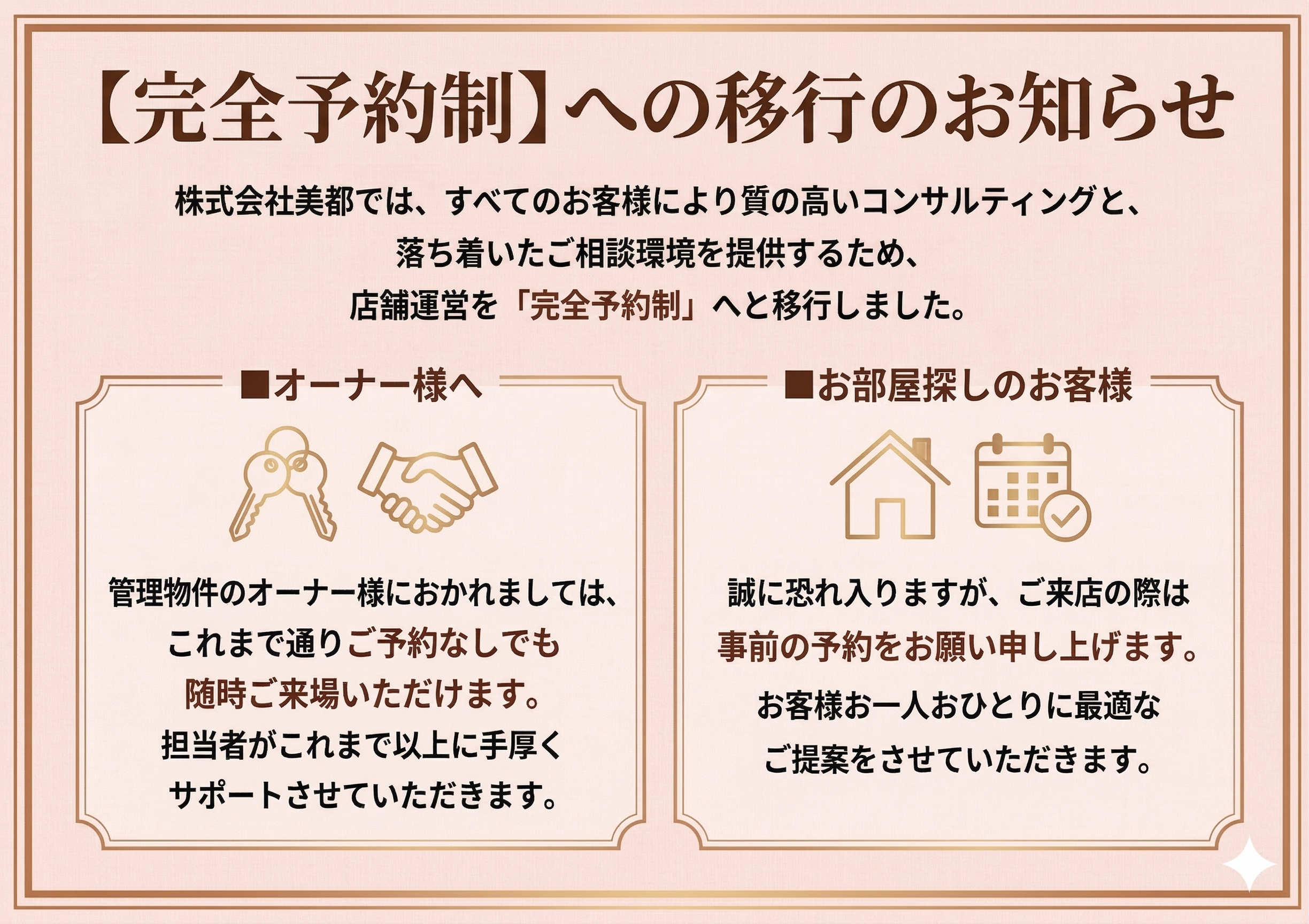 さて、弊社ではこの度、さらなるサービス品質の向上とオーナー様の大切な資産を守る業務に注力するため、店舗運営体制を大幅に刷新し、「完全予約制」へと移行することといたしました。